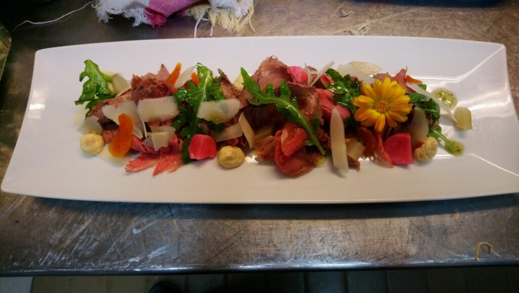 mit Ruccola, selbst eingelegte Gurken und Radieschen, Parmesan und Marillensenfsauce ( Kräuteröl, aus dem eigenen Garten )