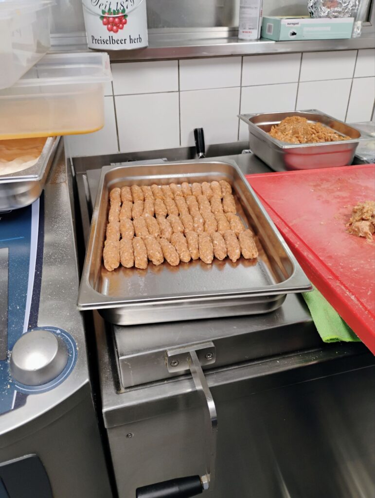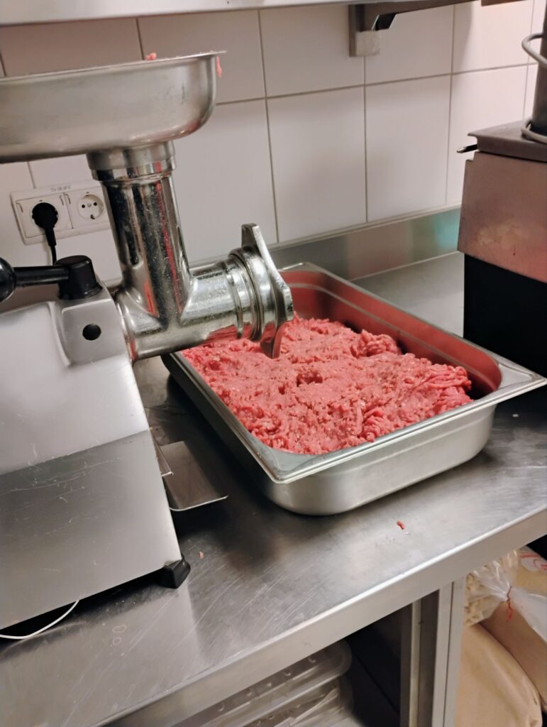 Fleisch und rohe Zwiebel würzen und kuttern etwas nachwürzen und ziehen lassen..