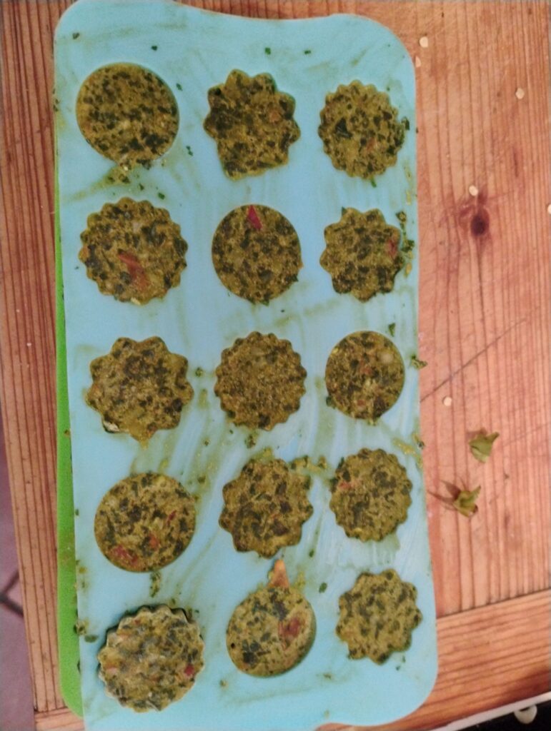 In das Pesto Zitrone & grobkörnigen Pfeffer hinzufügen und die abgekühlte Paradeiser -Sahne Masse dazu mixen , in Eiswürfel Formen füllen und einfrieren….